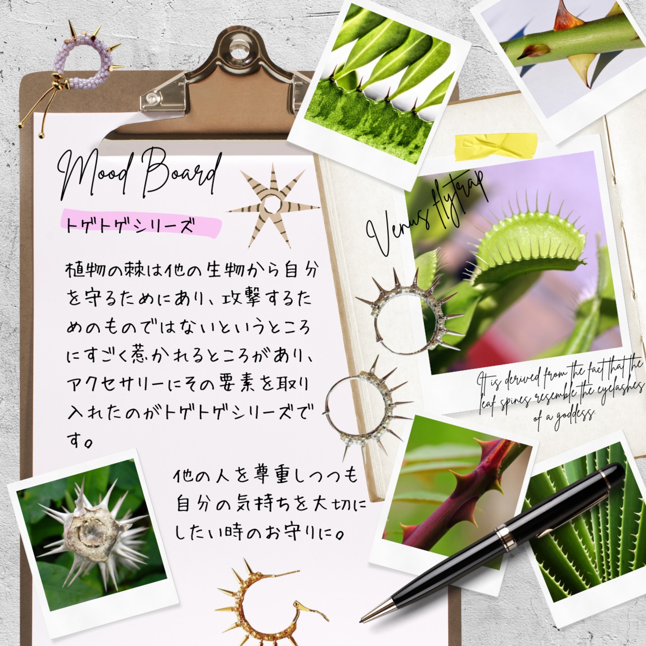 自分を傷つけようとしてくるものから自分を守るためにある植物の棘にインスピレーションを得て、マインド的にもデザイン的にも取り入れたのがこちらの「トゲトゲシリーズ」です。