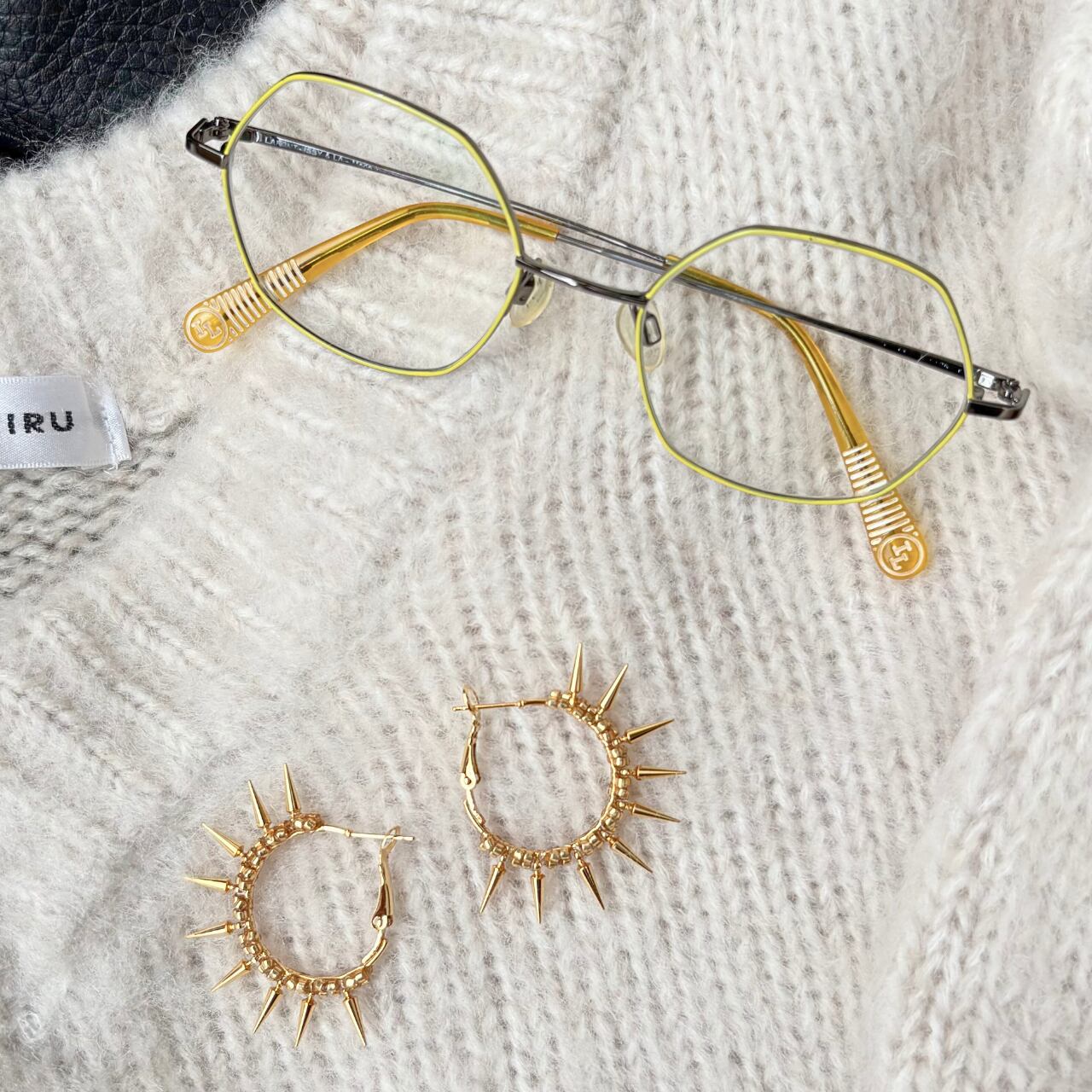 大ぶりなフープモチーフに施されたスパイキーなメタルパーツとビーズが、光を受けて美しく輝きます。