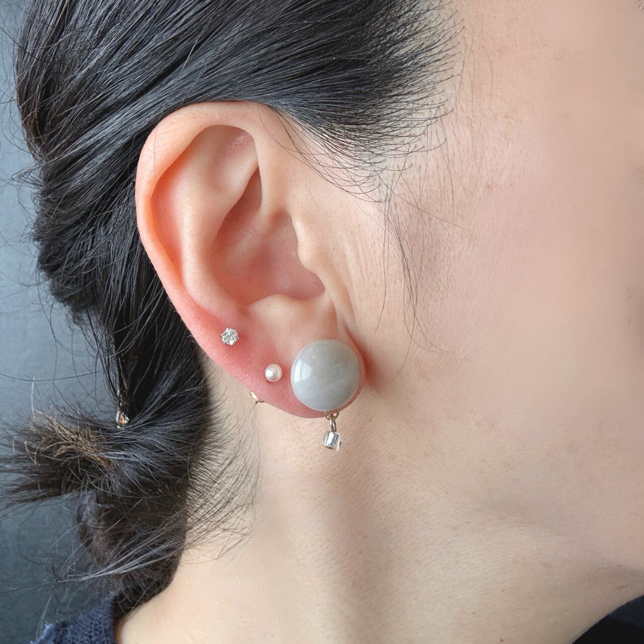 金属アレルギー対応のピアス金具仕様のアイテムです。通常タイプのピアスキャッチの他、下向き防止キャッチもお付けいたします。ご着用時にお役立てください。