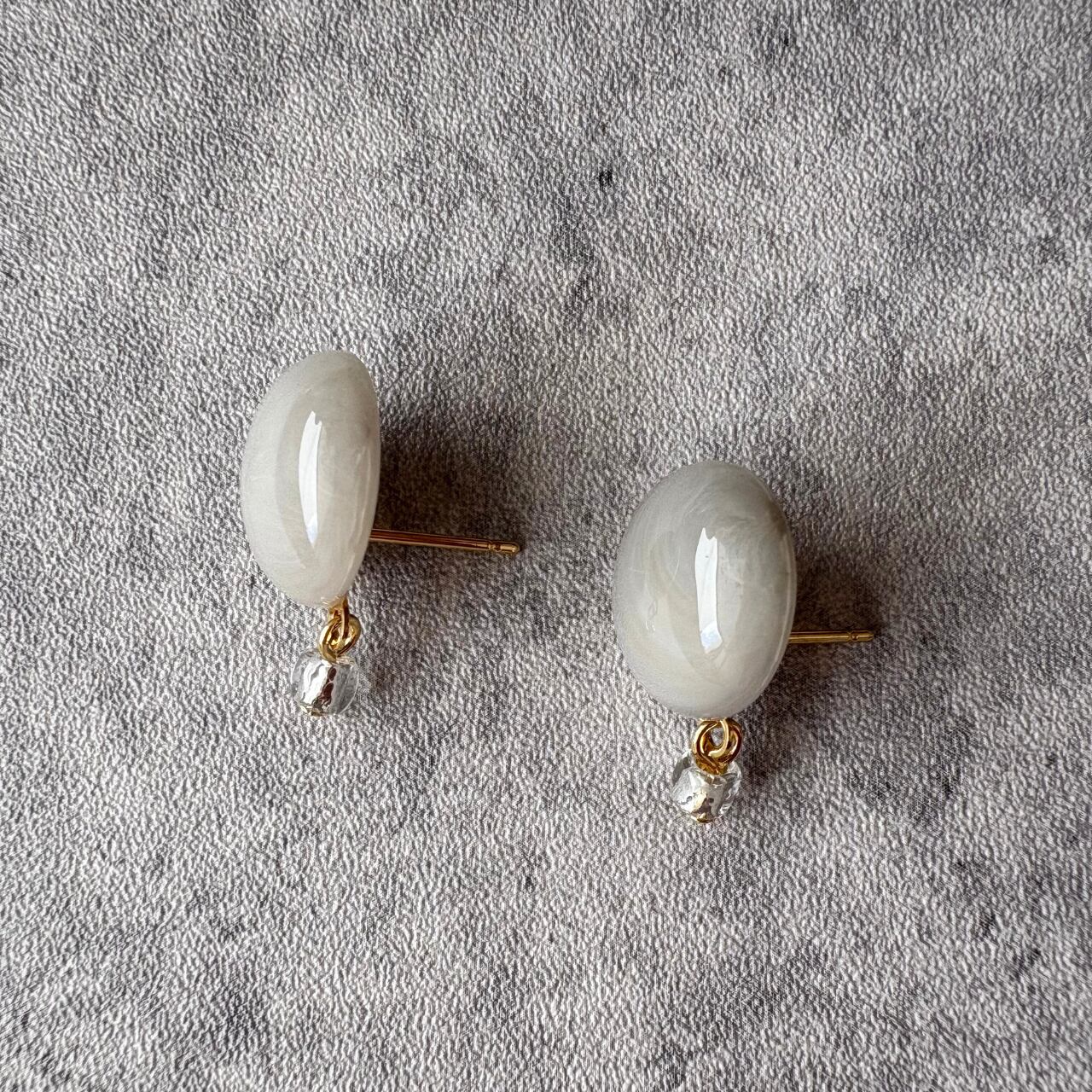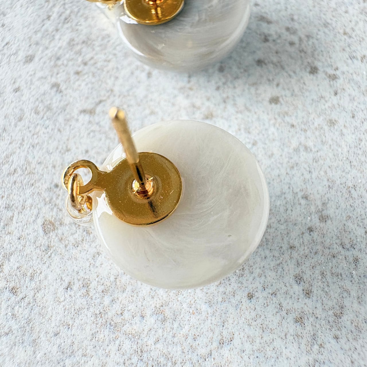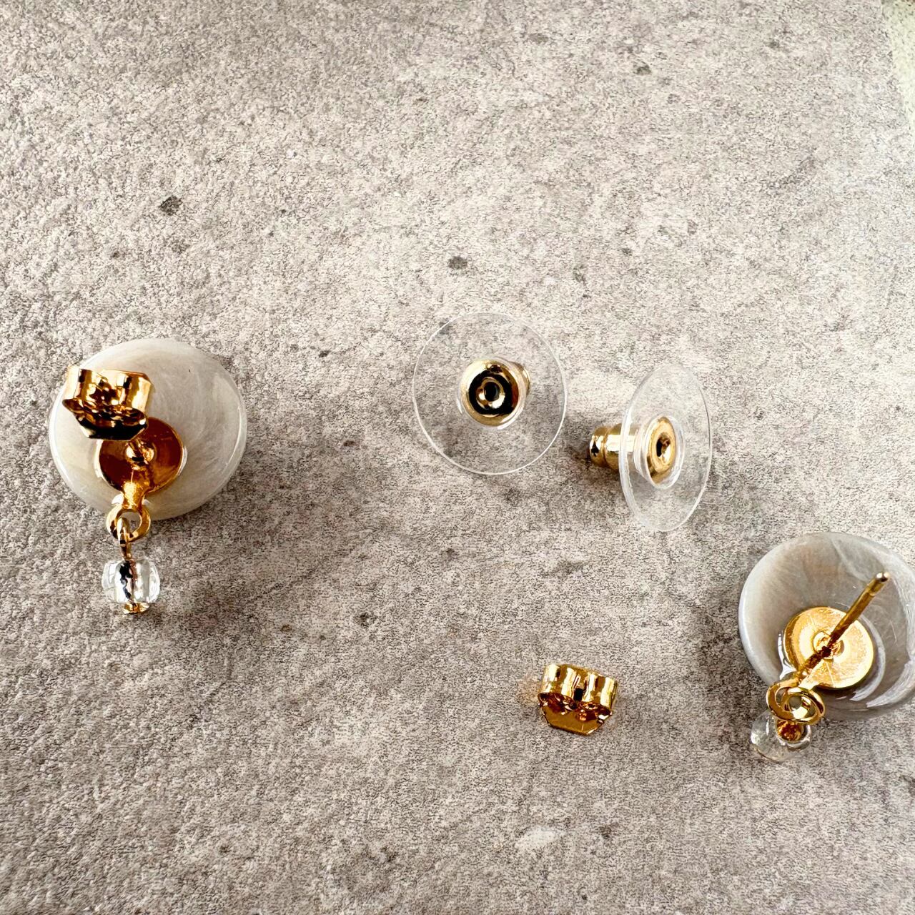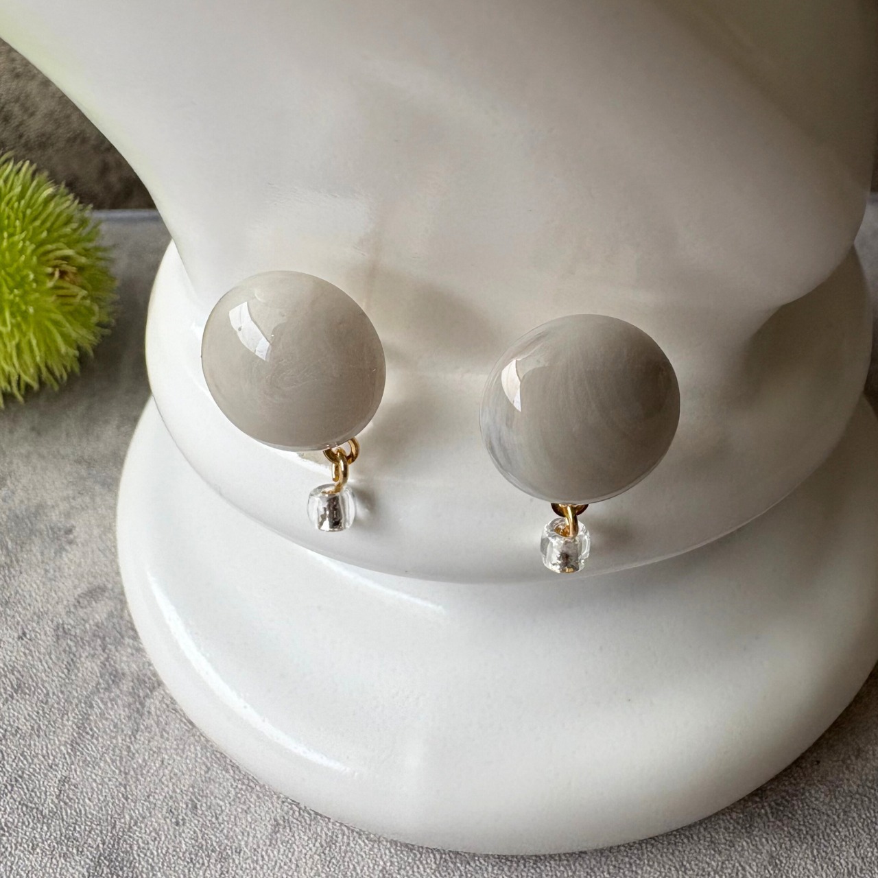 アクリルカボションの丸いフォルムとゴールドのニュアンスを感じる落ち着きのあるライトグレーのマーブルカラーが魅力的な『アクリルカボションの魅惑のピアス』。