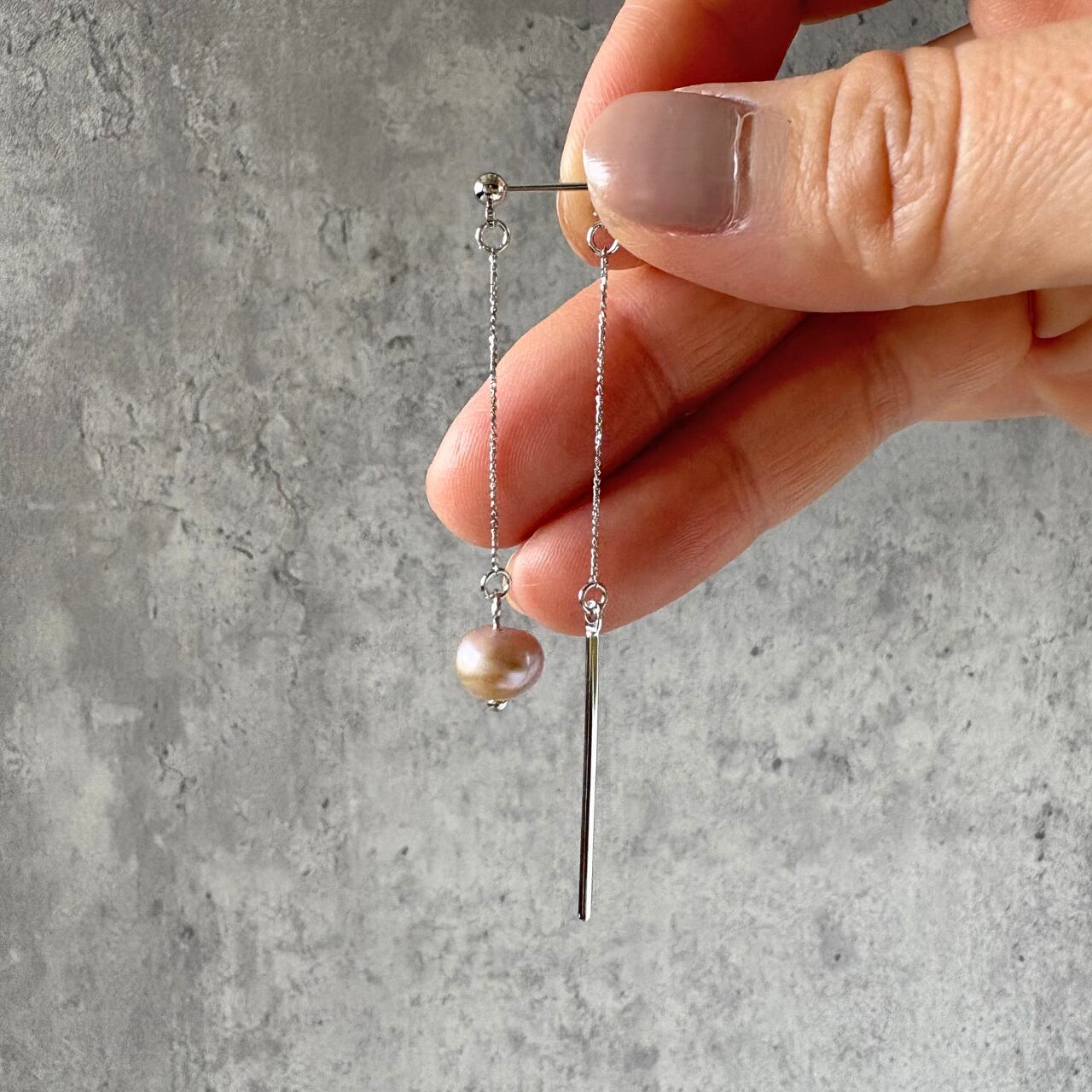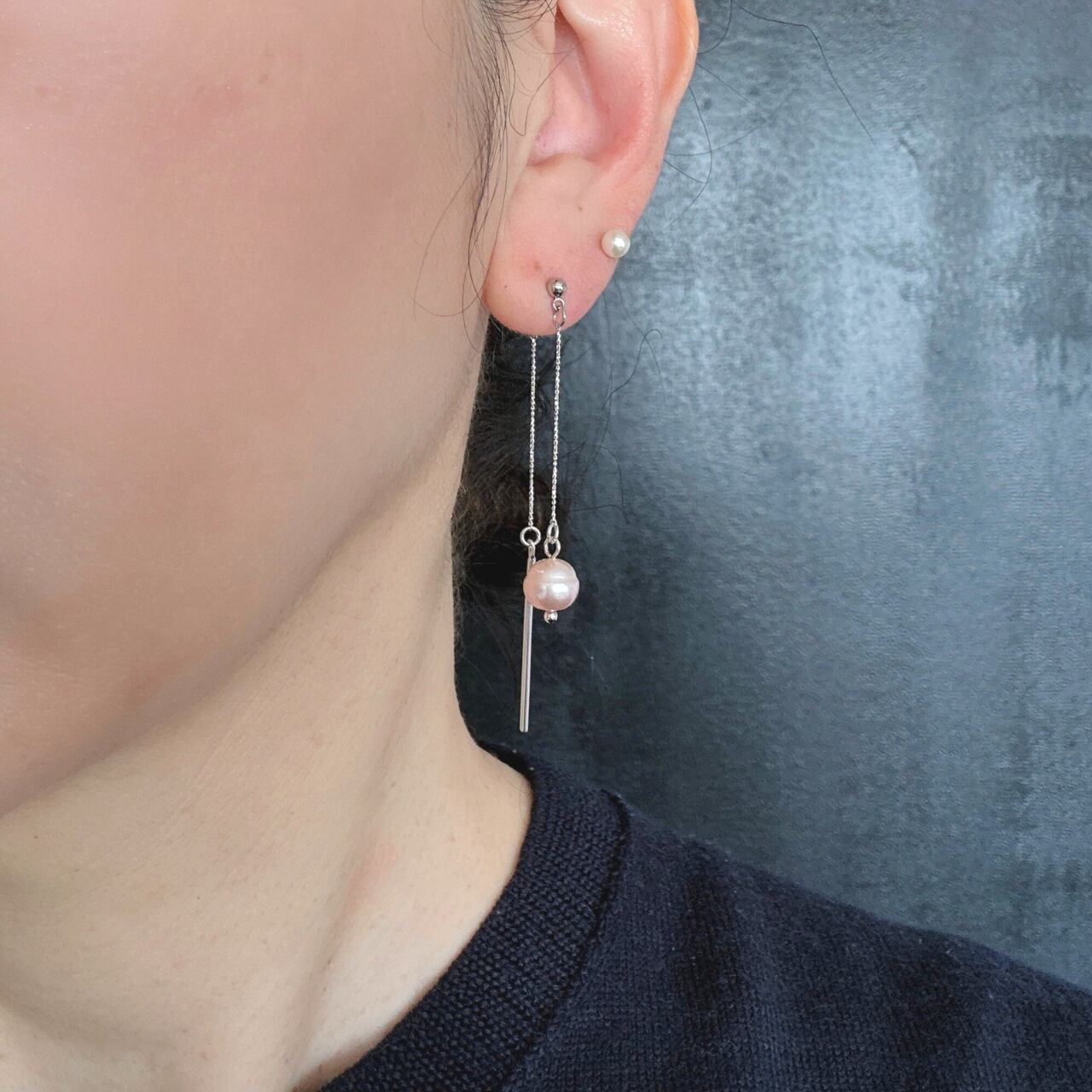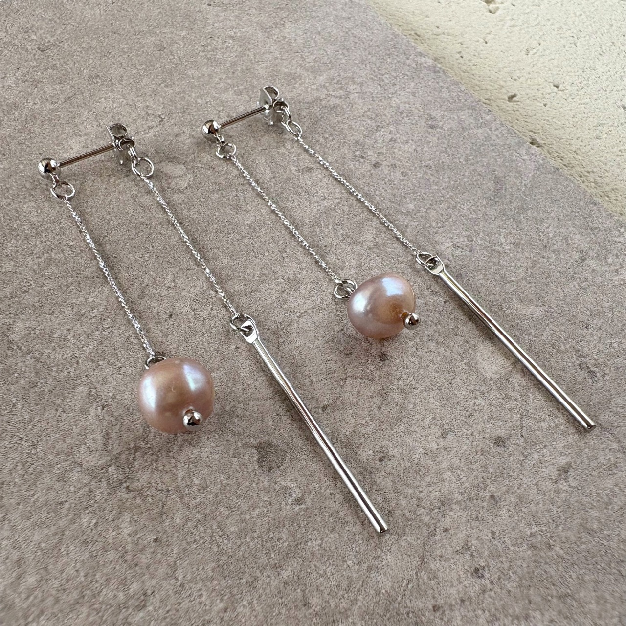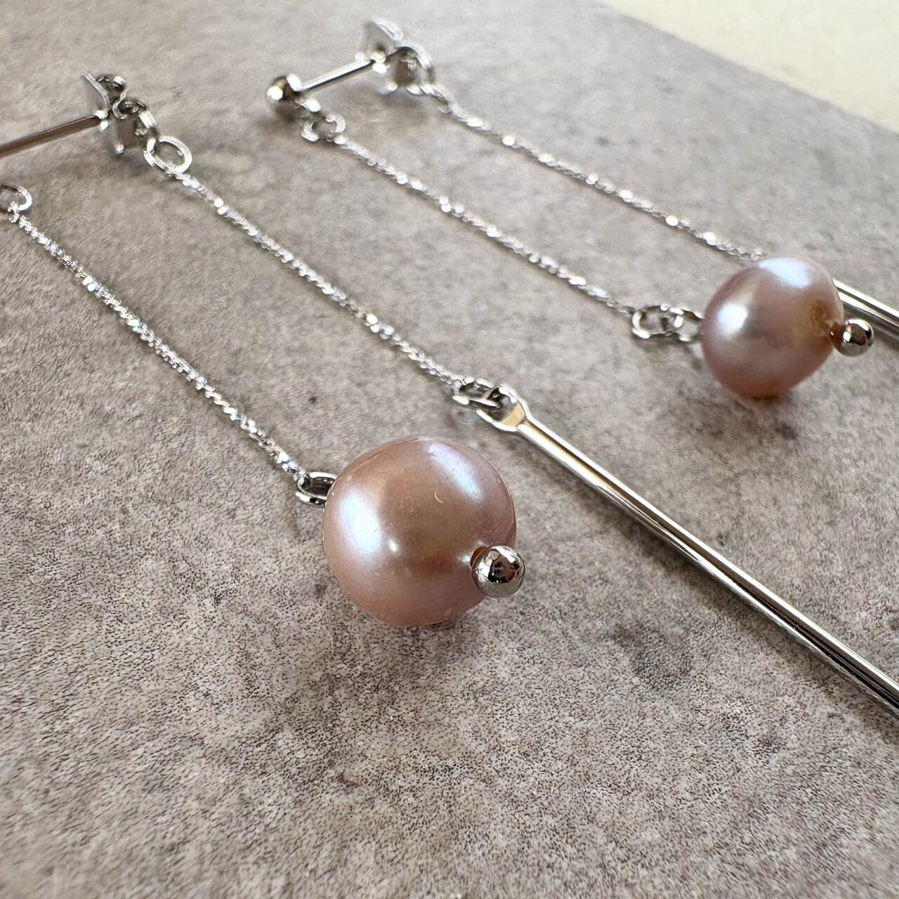 前後で異なる表情を楽しめる、バックキャッチタイプの『淡水パール (バロックパール )とスティックの揺れるピアス』。