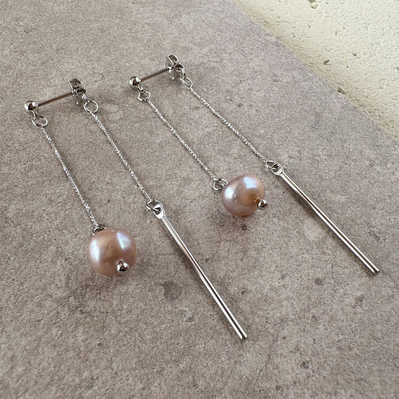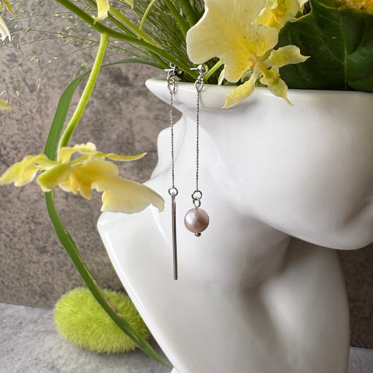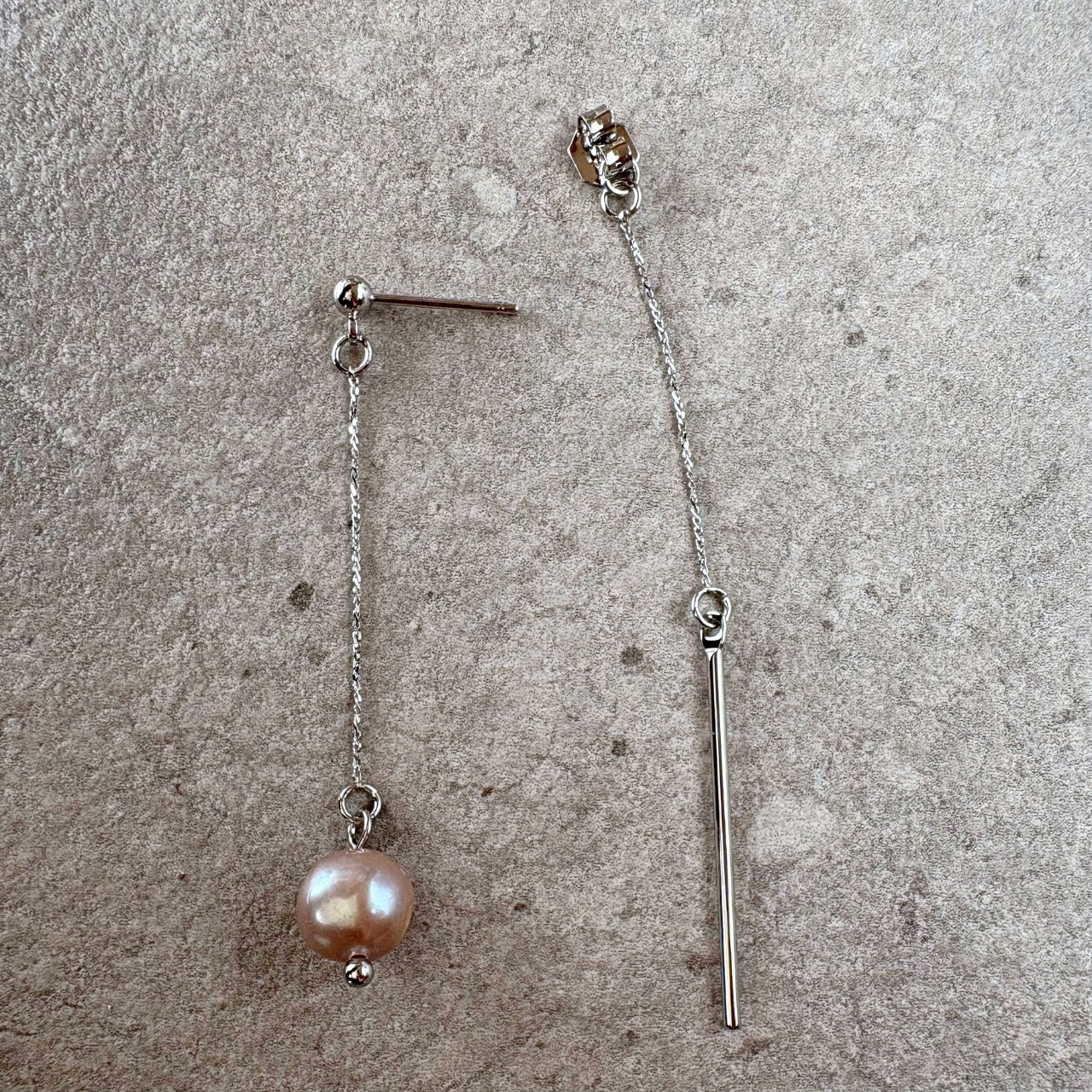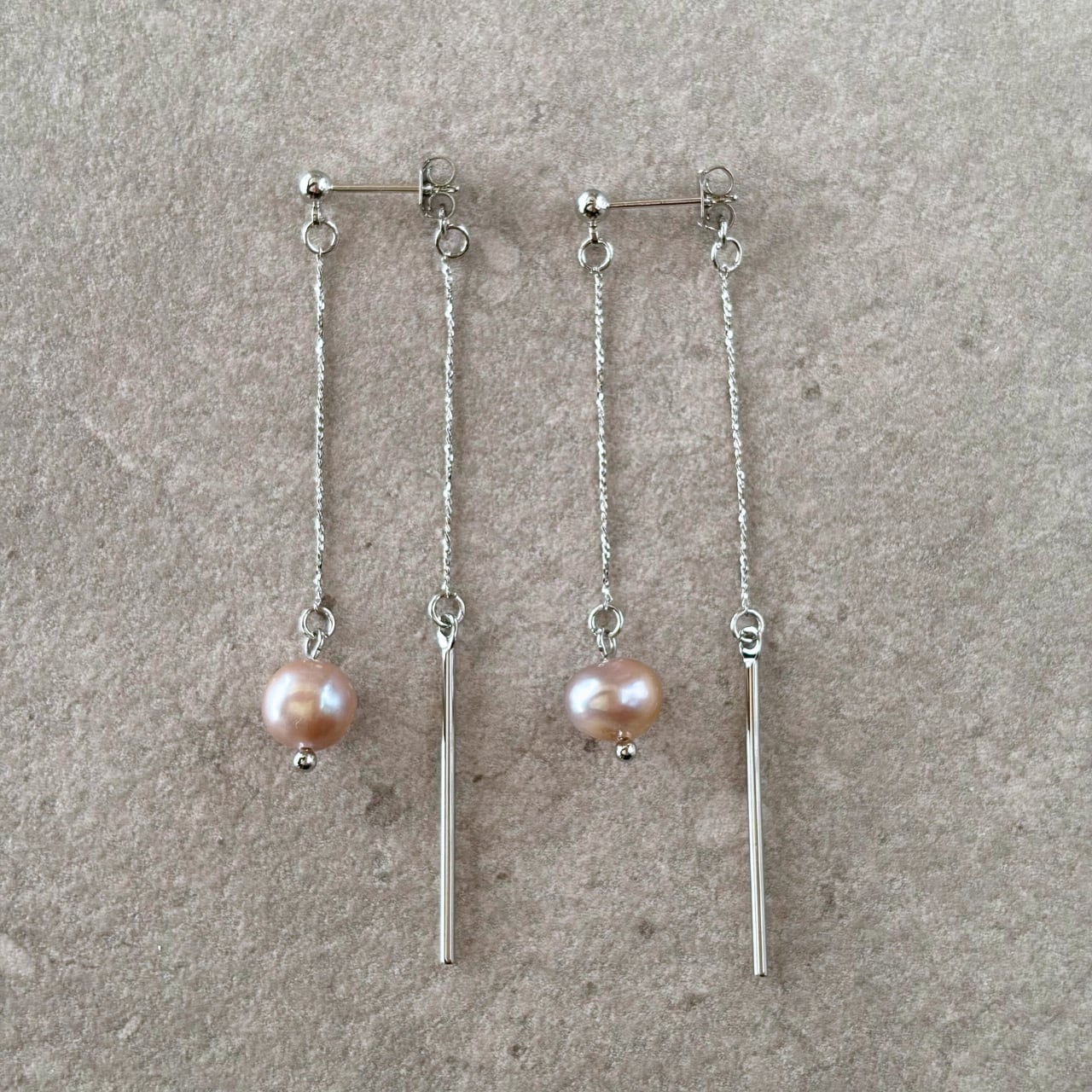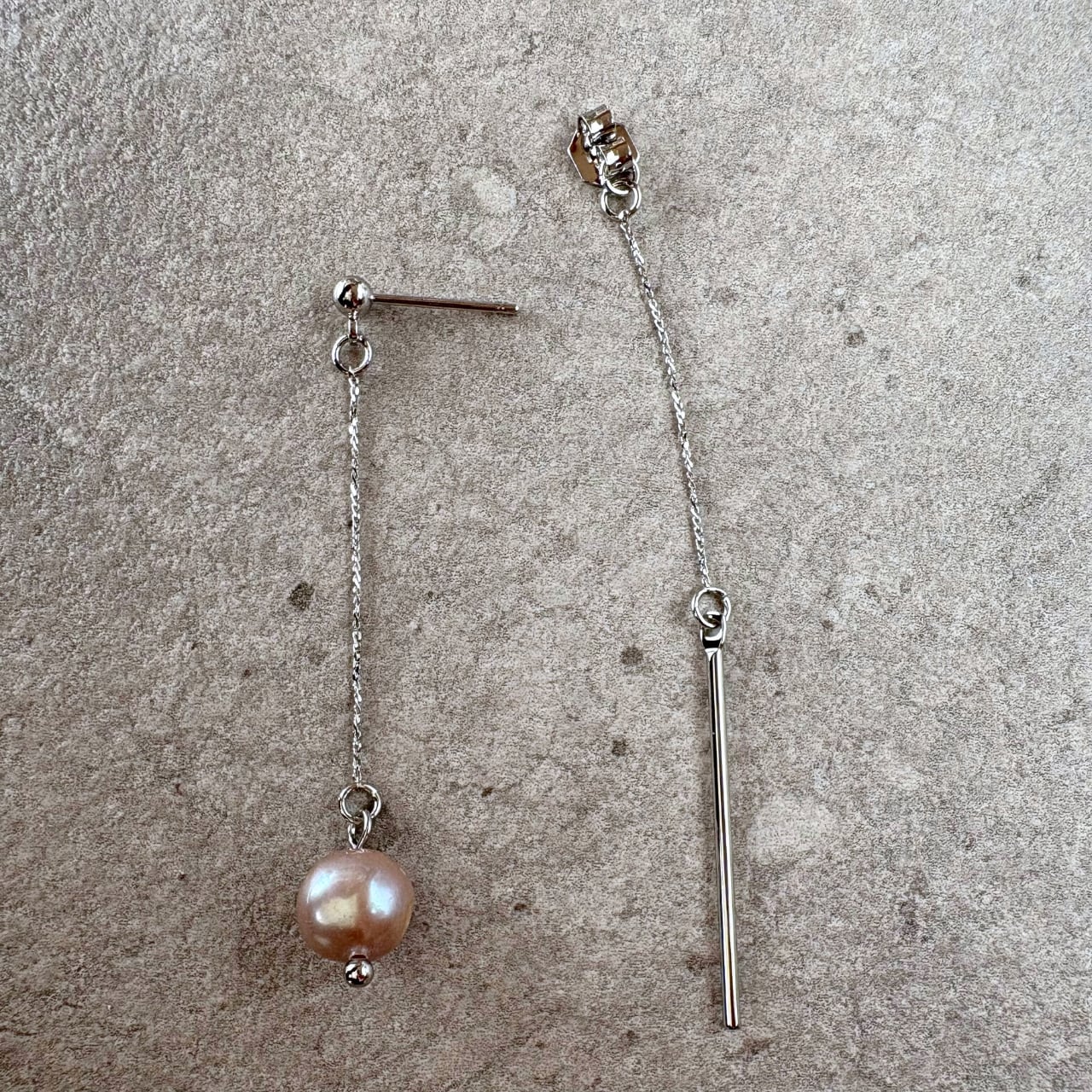 前後で異なる表情を楽しめる、バックキャッチタイプの『淡水パール (バロックパール )とスティックの揺れるピアス』。