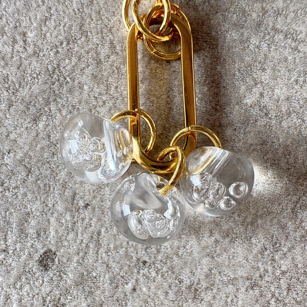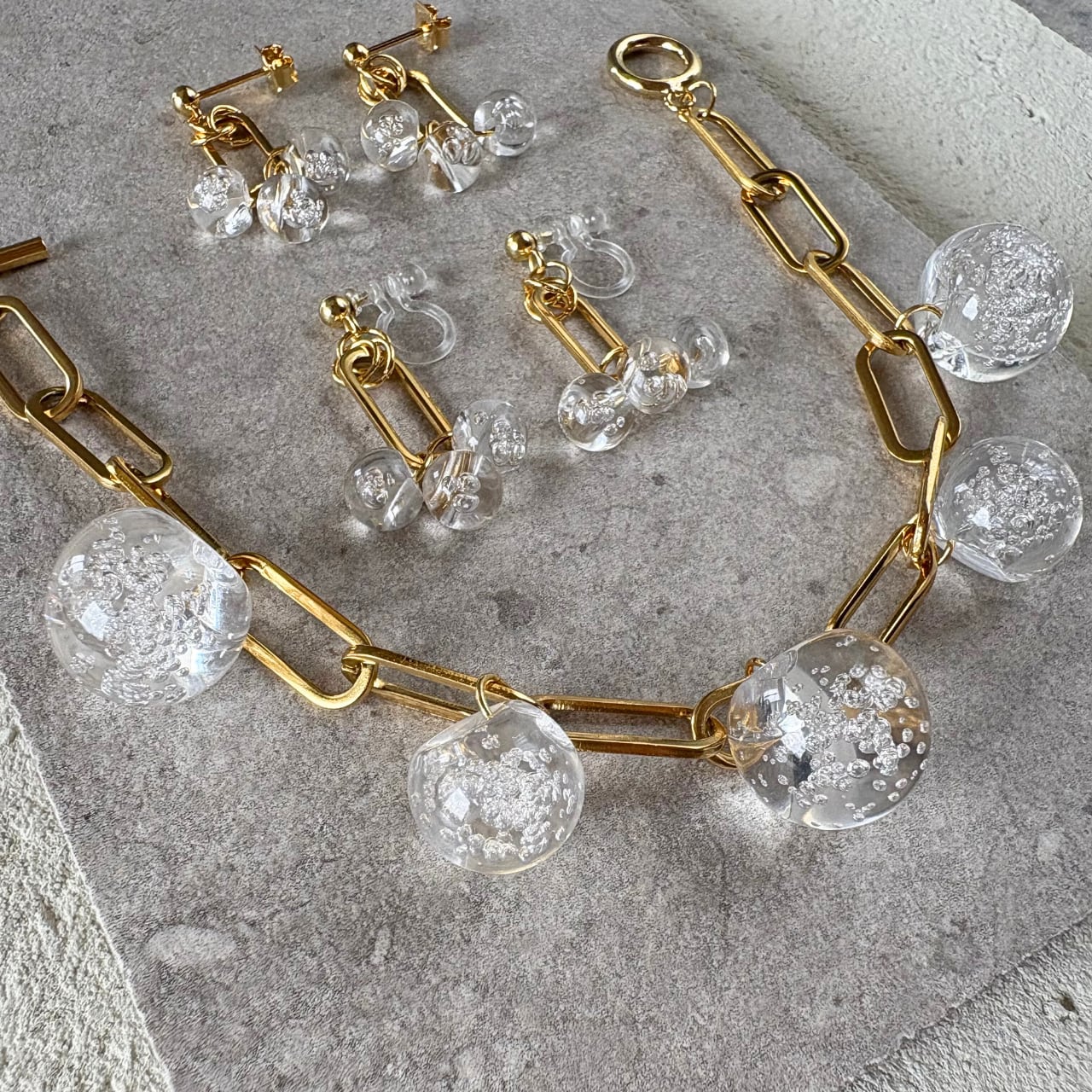 普段目に見えない空気を閉じ込めて見える状態になっているものに不思議さと美しさで目を奪われてしまうところがあり、それをアクセサリーのパーツとして取り入れたのがこの「泡モチーフ プクプクシリーズ」です。