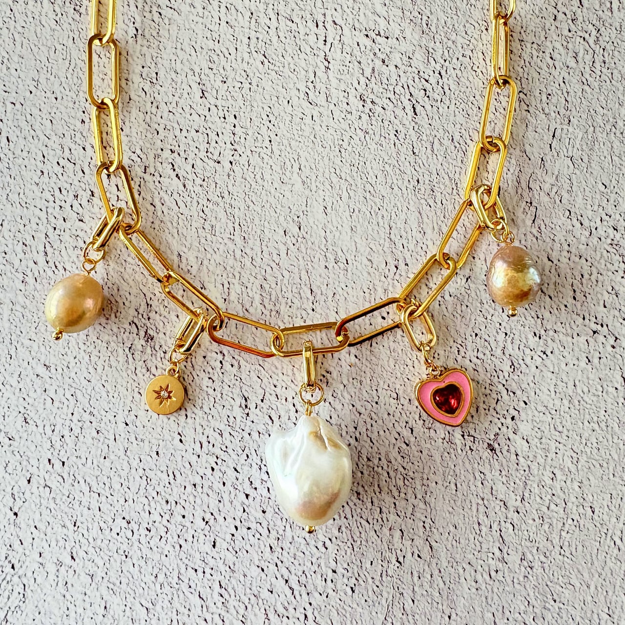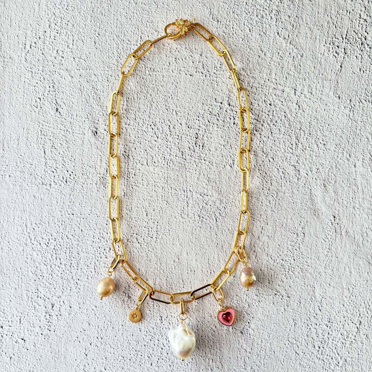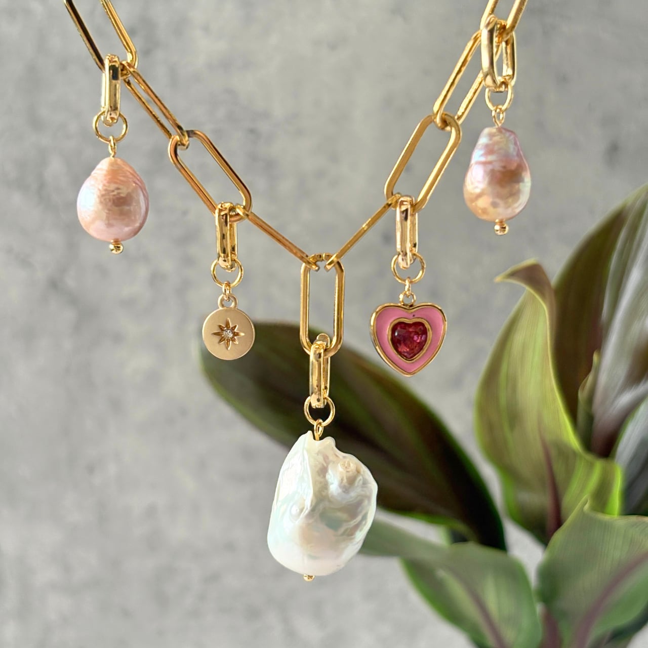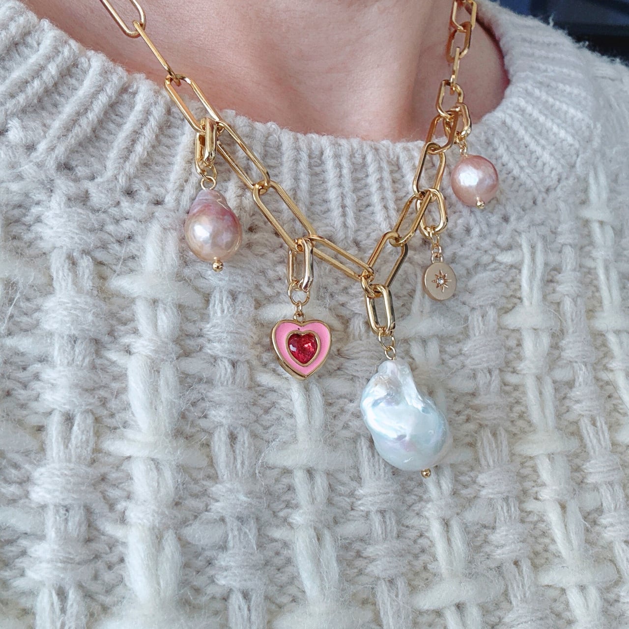 魅惑の大粒バロックパールと誕生月チャームのチェーンネックレスが、大人のカジュアルなコーディネートのアクセントとなり、貴方のスタイルをワンランクアップしてくれます。大切な人への誕生日プレゼントにも最適です。