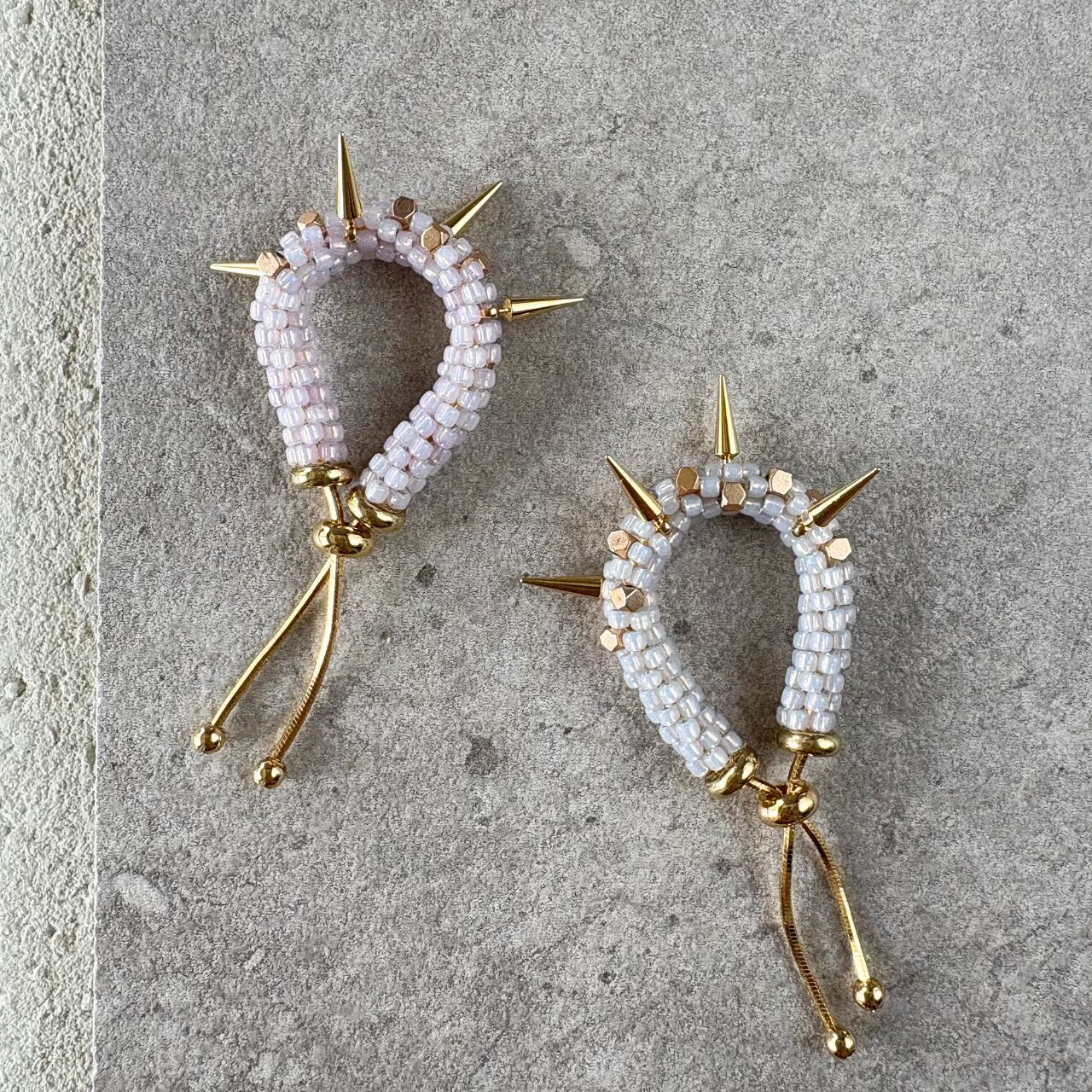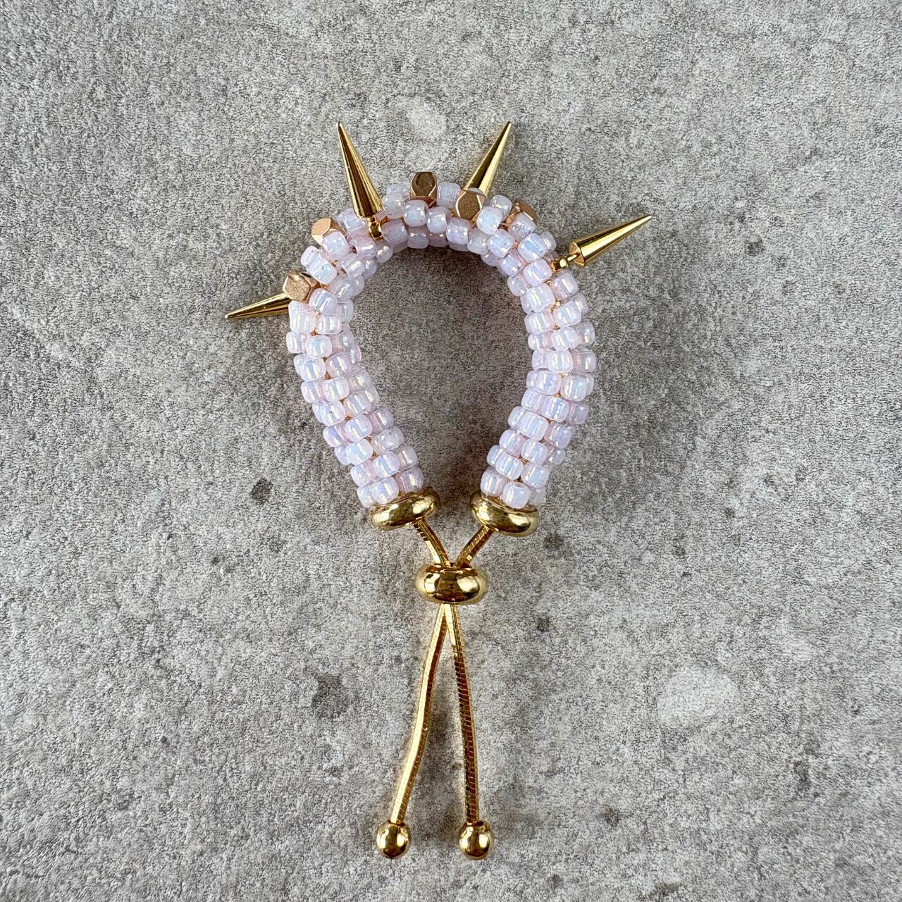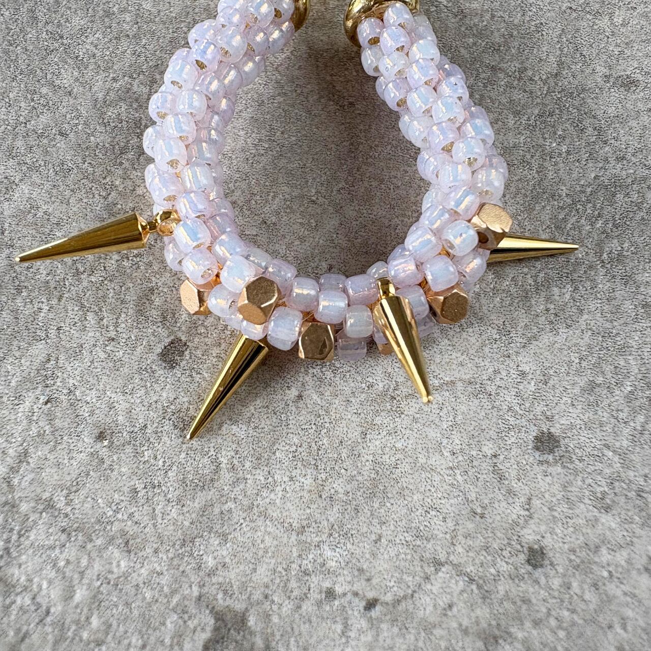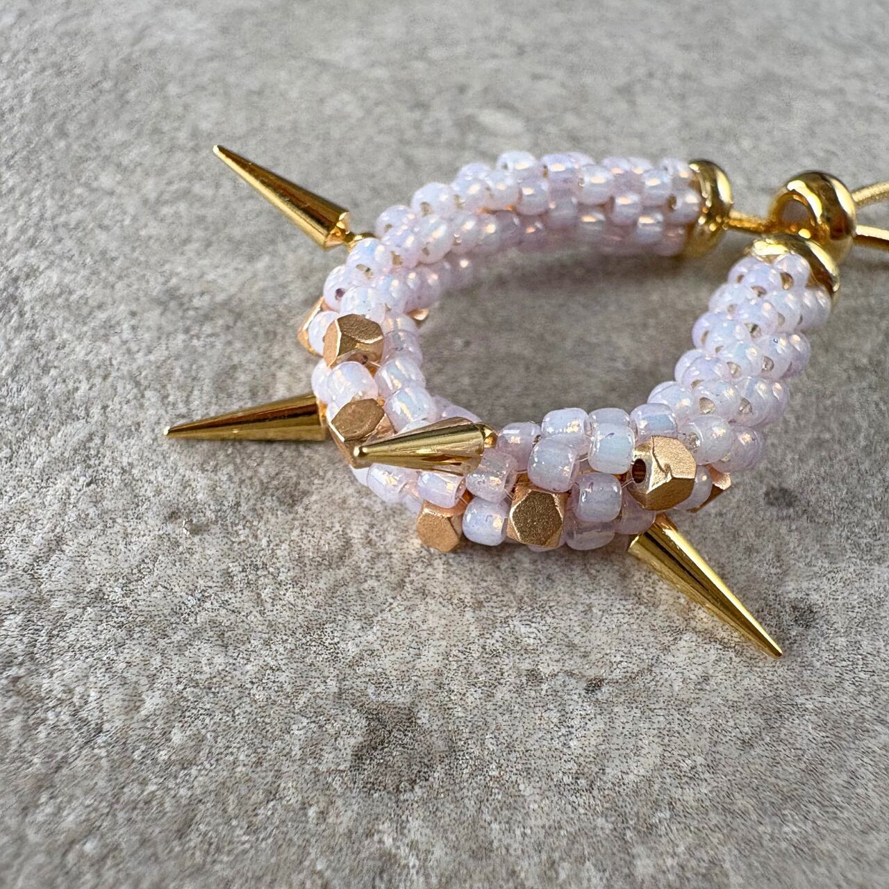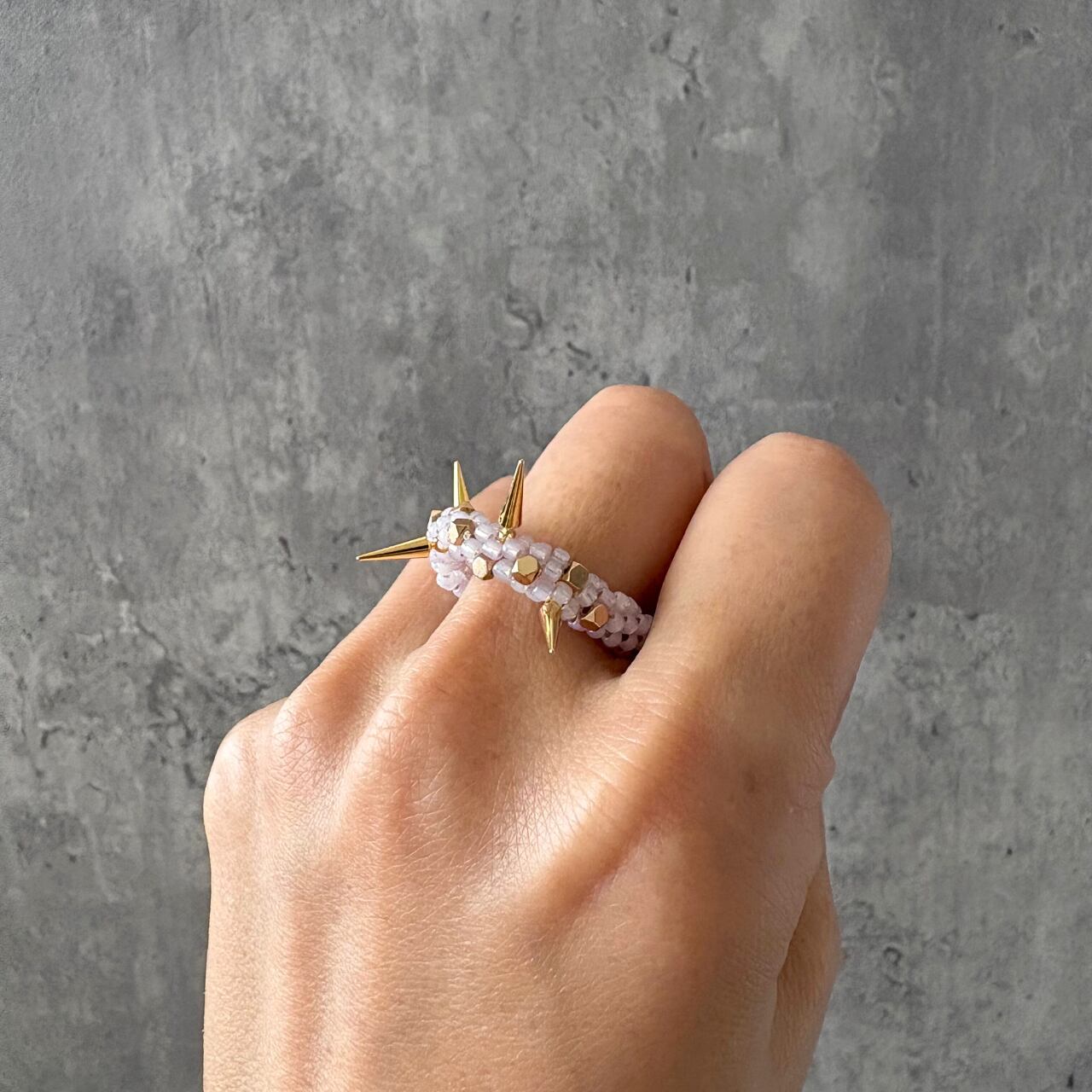 艶やかなガラスビーズとスパイキーなメタルコーンの組み合わせが独自の存在感を放つ個性的なリングです。