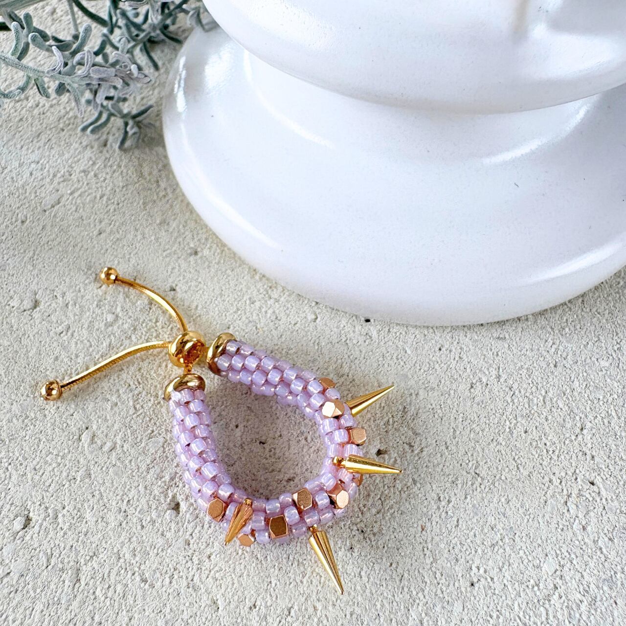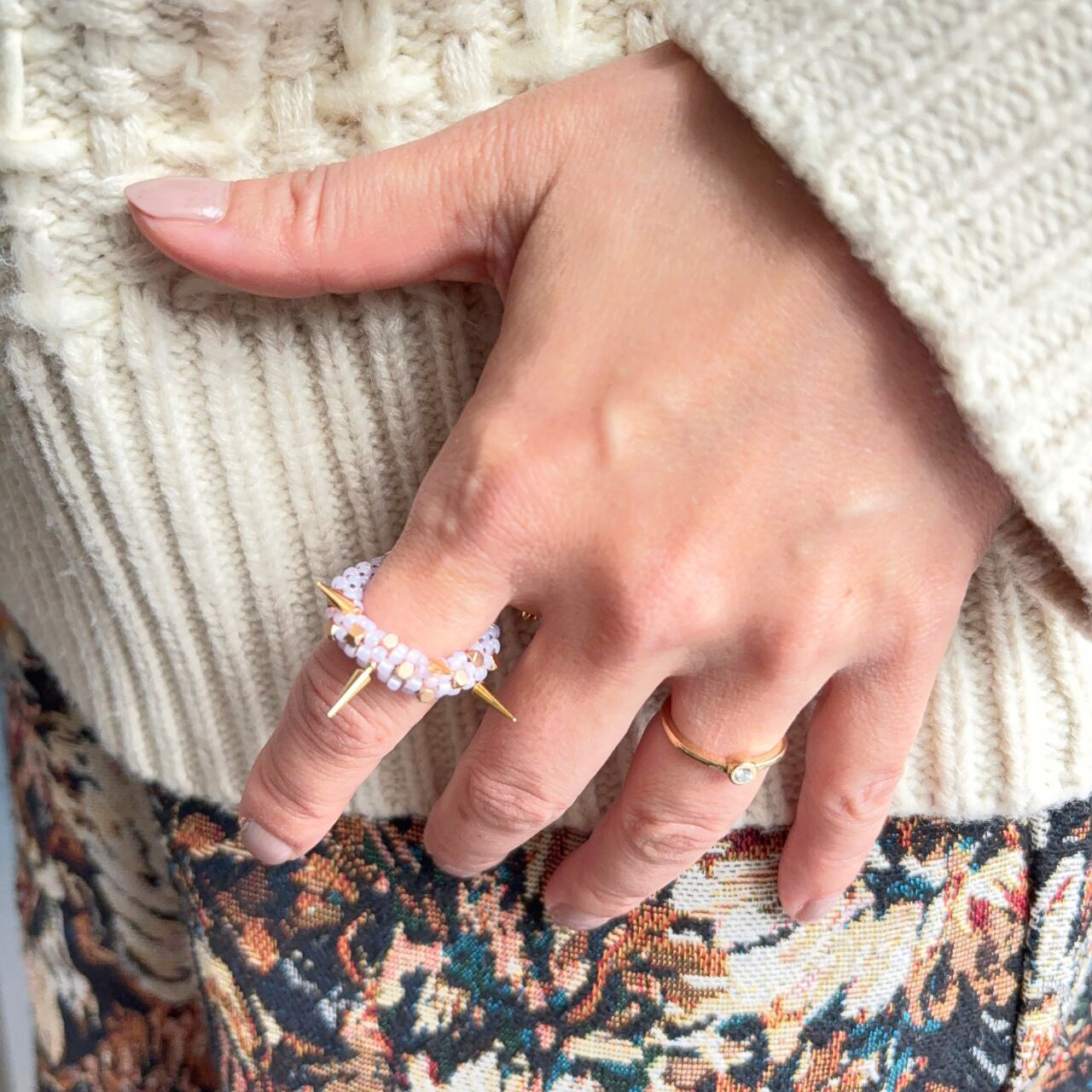 【サイズ調節可能】グレイッシュパープル ガラスビーズ×多面体メタルビーズ トゲトゲリング|ゴールド ビーズリング スパイク スタッズ 個性的 大人カジュアル